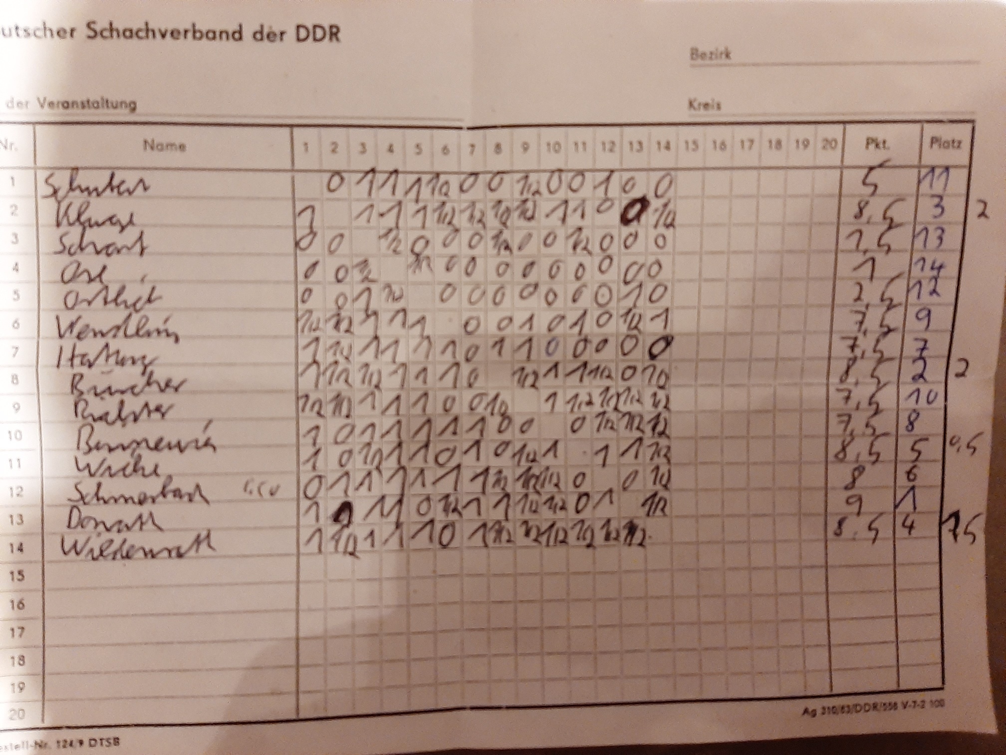 für ein Rundenturnier ohne KO-Modus. Mit dabei diesmal gleich 2 Sülze-Neulinge, Markus Binnewies von Roter Turm Halle und Martin Wicke vom PTSV Halle. Es entwickelte sich ein sehr spannendes Turnier, kein Spieler blieb ungeschlagen. Nicht weniger als 10 Spieler hatten bis 2 Runden vor Schluss realistische Chancen auf den Tagessieg, der Erstplatzierte lag gerade mal 1,5 Punkte vor dem 10. Am Ende setzte sich Simon Donath mit 9 Punkten aus 13 Partien durch. Nur einen halben Punkt zurück lagen 4 Spieler gleichauf, die große Rechnerei begann. Schließlich hatte Sven Büscher in der 3. Wertung die Nase hauchdünn vorn und sicherte sich Platz 2 vor Steffen Kluge, Dirk Wildenrath und Martin Wicke. Andre Schmerbach landete mit 8 Zählern auf Platz 6. Dahinter lagen erneut 4 Spieler (je 7,5 P) gleichauf, es musste erneut gerechnet werden. Katja Hartung, Markus Binnewies, Jens Wendling und Thomas Richter lautete die Reihenfolge. Die Plätze 11 - 14 belegten Achim Schubert (5 P), Thomas Ortlieb (2,5 P), Simeon Scharf (1,5 P) und Reiner Ose (1 P).